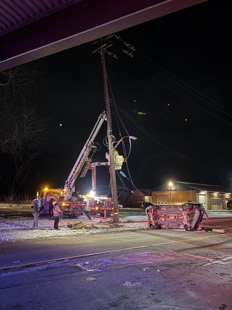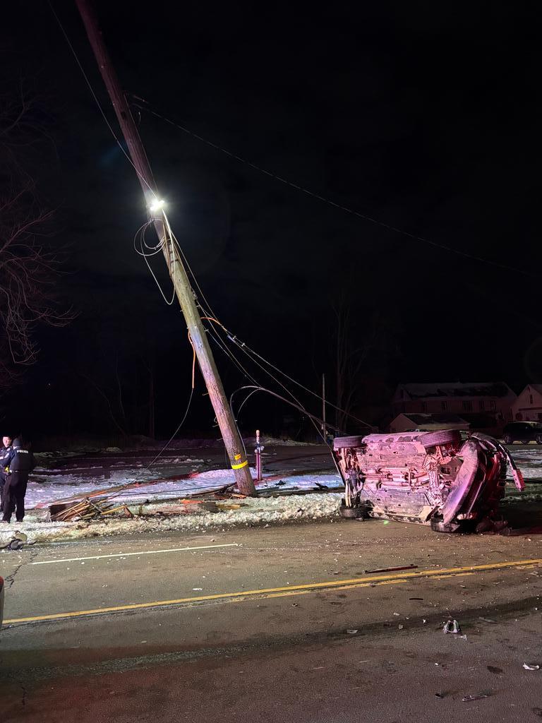 Responding units arrived to find all vehicle occupants safely out of the vehicles. A NYSEG utility pole had been broken off at its base and was being supported by the primary power lines. The Thruway Authority was notified because of low-hanging wires over Rt 90.